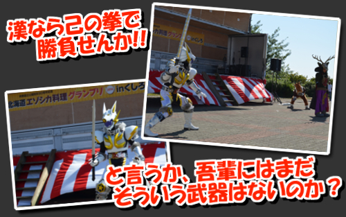 奴もこのイベントでは、エゾシカ肉消費推進をご高説しにノコノコ来たようだが…我々エゾシカ団自身がその役目を負うことで、より説得力が増すのだ!そこんとこを奴はまだまだ解っておらぬゆえ、余計なお世話というものよ!そんな「虎の威を借る狐」ならぬ「狼の威を借るおジャマ虫」は、軽ーくひねり潰してくれよう!